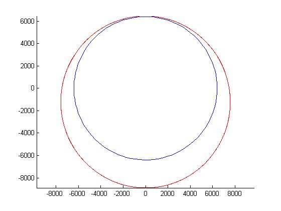 Spodaj je z rdečo narisana orbita rakete, ki jo izstrelimo z začetno hitrostjo 8.5 km/s v desno