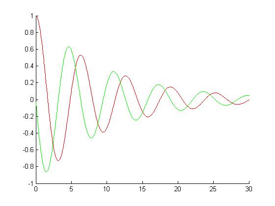 Tu je graf časovnega poteka položaja (z rdečo) in hitrosti (z zeleno),